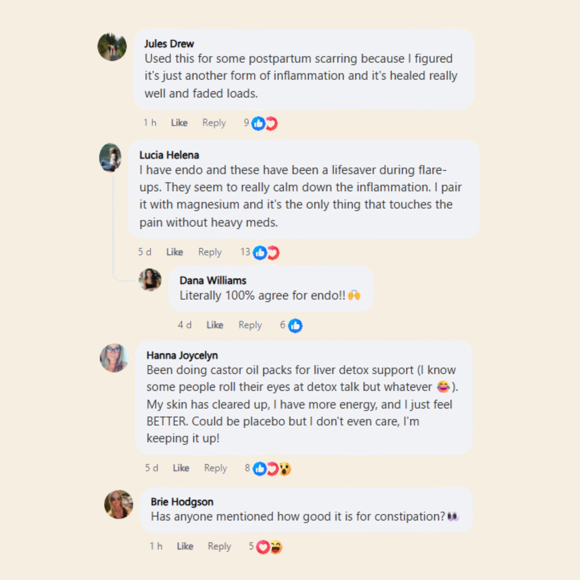 Battled with PCOS and extremely painful periods plus pain from cysts bursting. I was at my wits end, but for my past 3 cycles I’ve done castor-oil packs once per week for one hour each and I’ve seen nothing but amazing benefits. It has SIGNIFICANTLY decreased my symptoms: cramping, ovulation pain, bloating, etc. Also completely regulated my cycles!